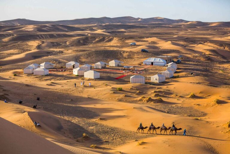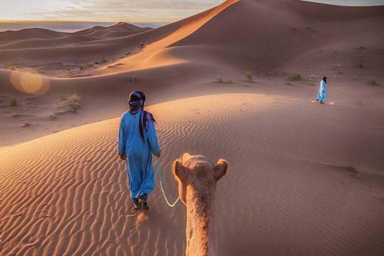 Visit Marrakech’s historic medina and imperial cities like Fez and Meknes, Explore the Atlas Mountains to the serene beauty of the Imlil Valley, Spend the night in the Merzouga Desert with camel riding and camping under the stars.