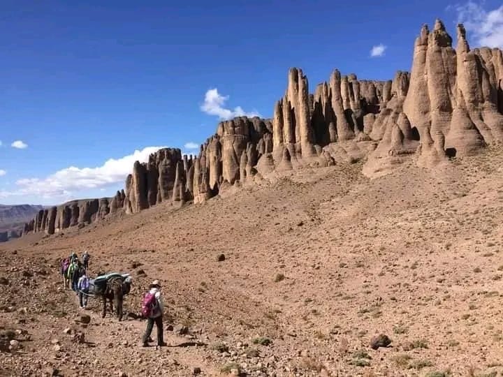 We descend through the Afourar valley which gradually transforms into gorges, we pass by the small Bouallouz oasis. Then we arrive at Ousdidene. The landscape opens onto an immense plateau dominated by the peaks of Bab n’Ali. After the climb towards the famous Bab n’Ali gate, then the continuation towards the oasis of Ighazoune. Night in tents. 5 hours of walking
