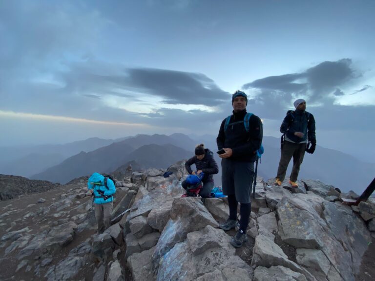The gigantic peak of Toubkal, also known as Jebel Toubkal, is the highest point in North Africa. Here is a description of this peak: Toubkal is located in the Atlas Mountains, Morocco, and it reaches an altitude of 4,167 meters, making it the highest peak in North Africa. Its majestic form dominates the surrounding mountainous landscapes. To reach it, one generally has to follow a route from the village of Imlil, located at around 1,740 meters above sea level. Climbing Toubkal is a memorable experience for hikers and mountaineers, but it can be demanding due to its high altitude. Climbing Toubkal offers breathtaking views of the Atlas Mountains and the Sahara in the distance on a clear day. The summit is often snow-capped in winter, adding to its charm. It is best to plan this expedition carefully, equip yourself with adequate equipment, and, in most cases, hire an experienced guide to ensure your safety. In addition to being a physical challenge, climbing Toubkal is an immersion in the natural beauty of Morocco, with its impressive mountainous landscapes and authentic Berber culture. It is an unforgettable experience for lovers of mountains and outdoor adventures.
